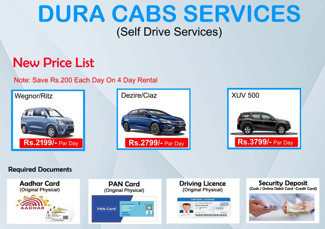 Self Drive Taxi Service - the reliable and affordable way to get around Agra. With our self-drive car services, you will enjoy a convenient and safe commuting experience. Get more control over your travel with our easy-to-use app and enjoy a comfortable journey at competitive prices. Our cars are well maintained and regularly inspected for quality assurance, so you can be sure of a enjoyable ride every time. Book your ride with DuraCabs today and experience hassle-free travel!